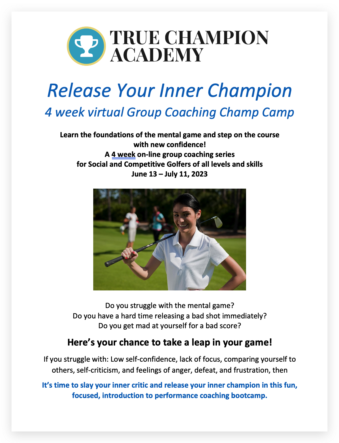 Join us for this one month virtual champ camp on the mental and emotional game, how to create confidence on the course, and how to become champion minded. For all skill levels. This is a foundation performance coaching course within a fun group setting. Download the flyer for more info.